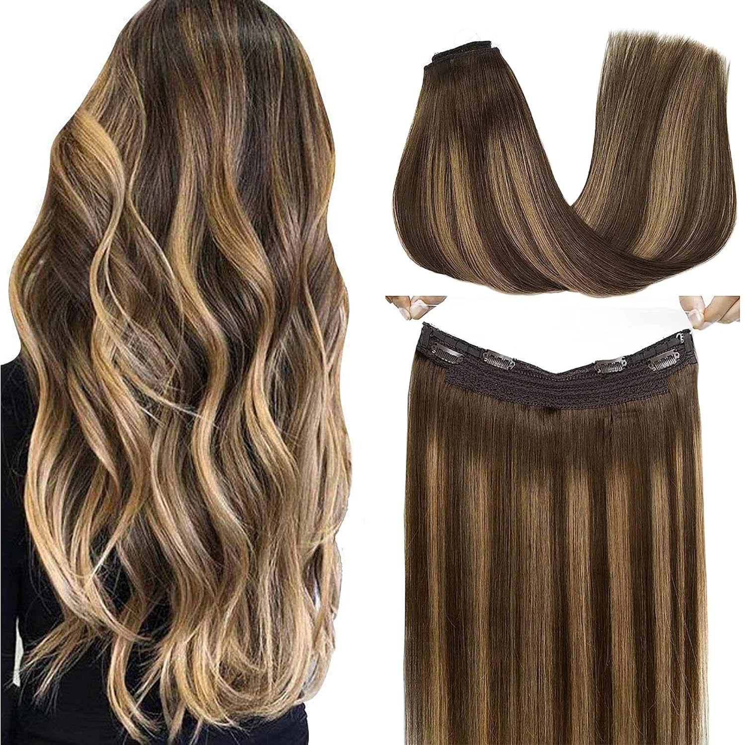 Wire Hair Extensions Real Human Hair, Halo Hair Extensions,16 inch 95g Chocolate Brown to Caramel Blonde, Invisible Wire Hair Extensions with Transparent, Straight Remy Hair Extensions